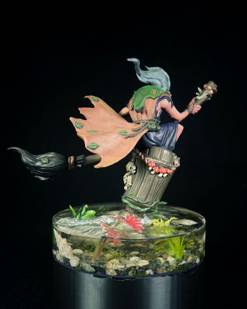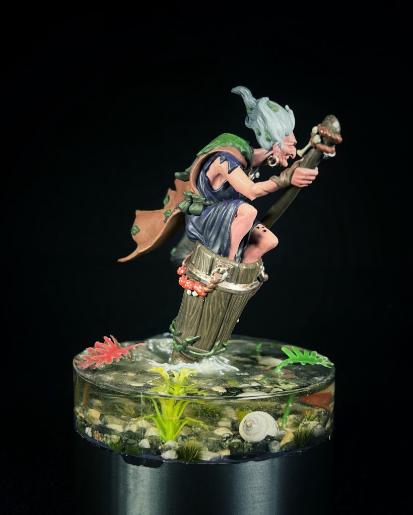 The entire base is clear resin, poured to become the pond itself. I added ripples and splashes around the mortar to make it feel like she’s cutting through space, not politely hovering above it. Her hands gripping the broom, her hunched posture, that face – none of it is meant to be friendly. This isn’t the version of Baba Yaga that helps you. This is the one that watches you leave.